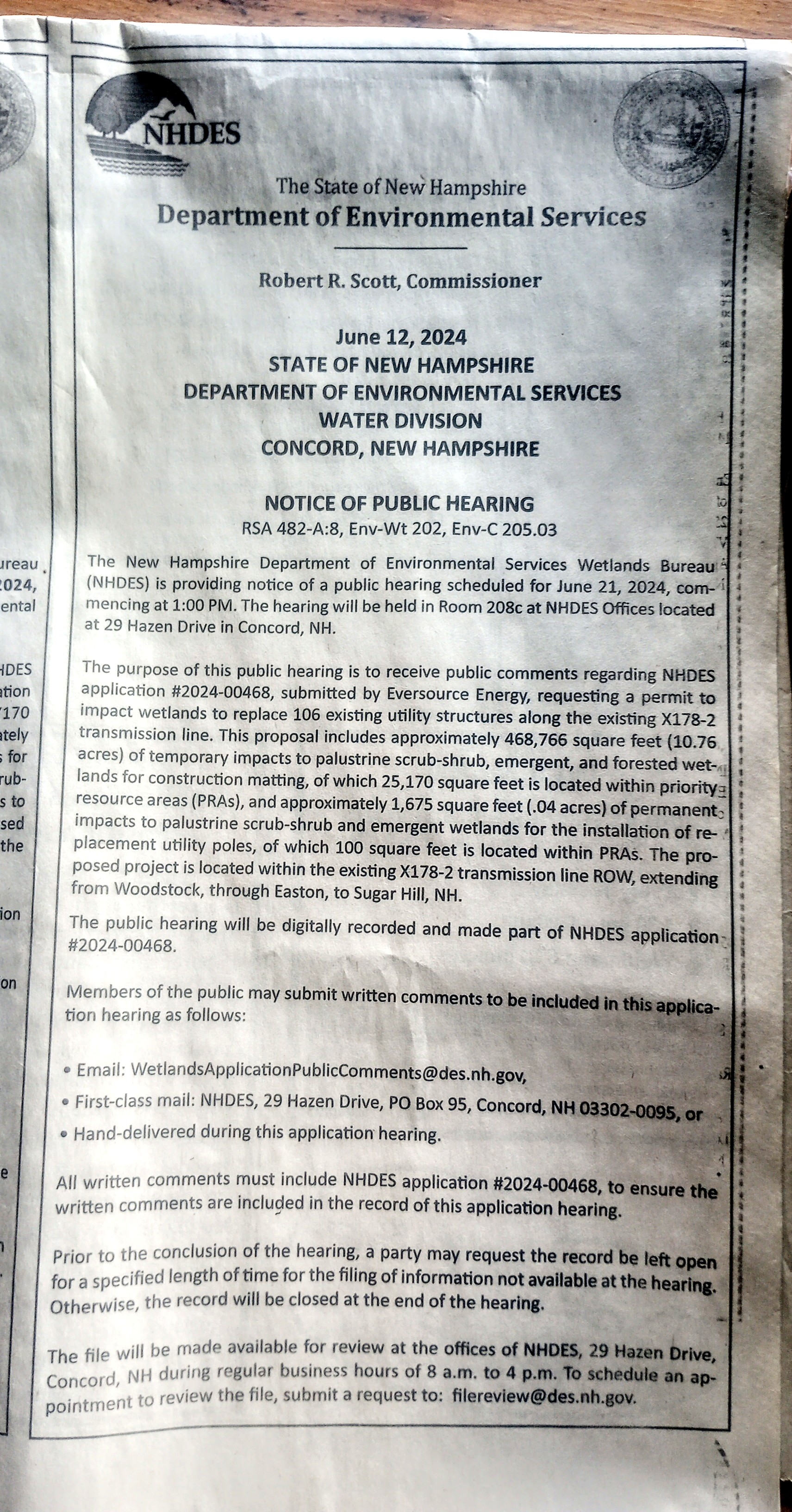 2025, March 26 (posted. Approved for consideration August 19, 2024): Forest Service proposed to give Eversource a Categorical Exclusion from NEPA requirements for an environmental assessment of Eversource's proposed X-178 line replacement, road and crane mesa construction in the Kinsman and Gordon Pond Roadless areas of White Mountain National Forest