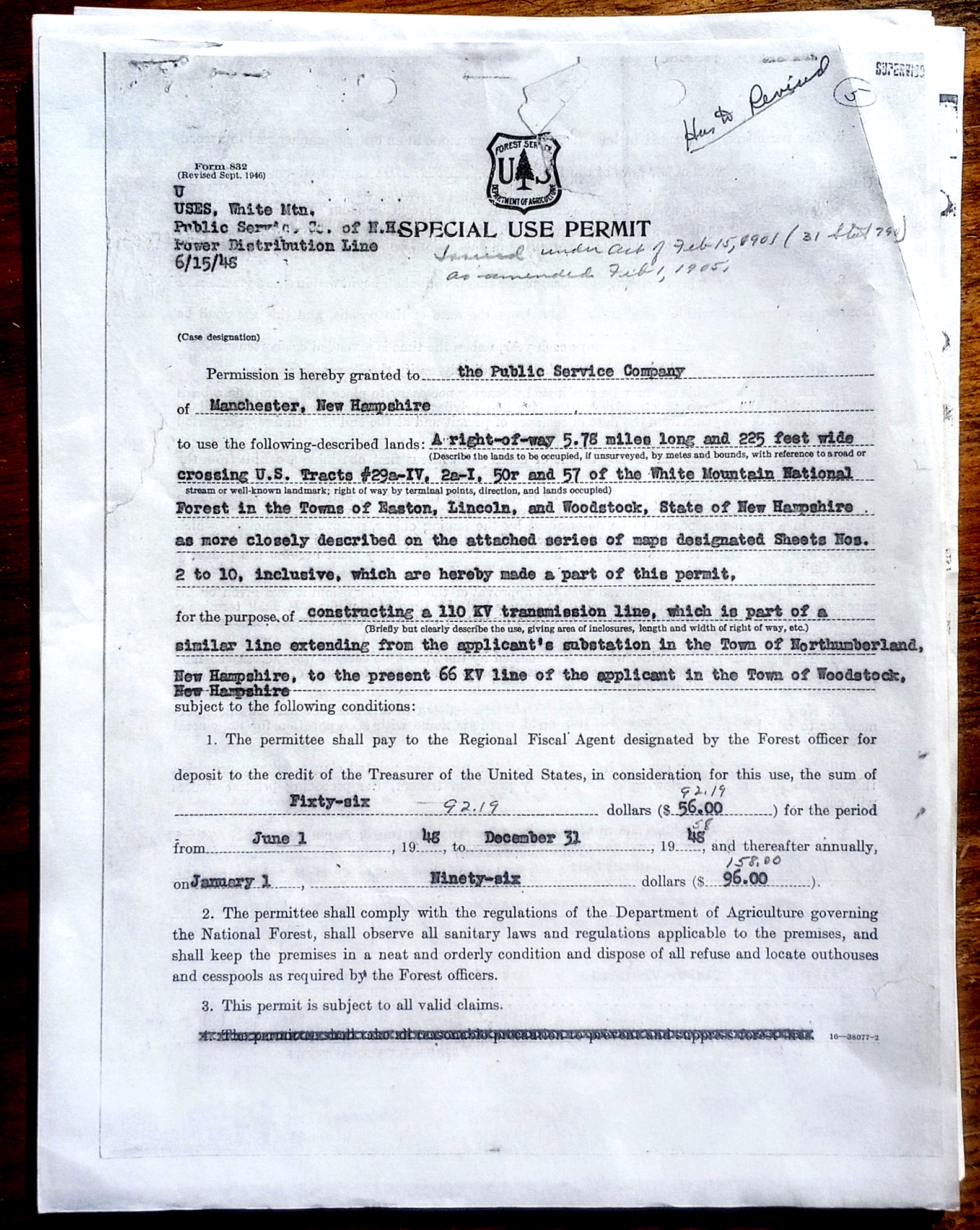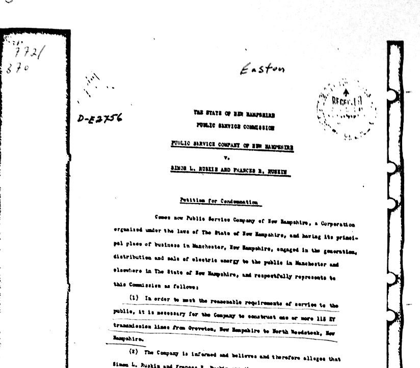 1948: portion of condemnation deed, Easton: "In order to meet the reasonable requirements of service to the public , it is necessary for the company to construct one or more 115kV transmission lines from Groveton, New Hampshire to North Woodstock, New Hampshire."