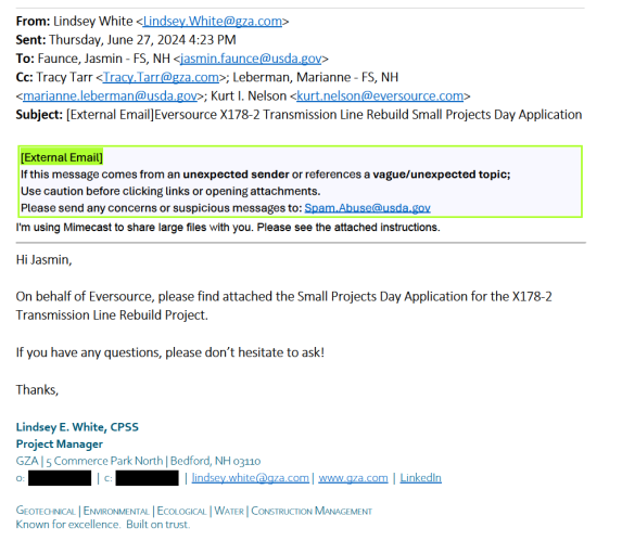 2025, May 14 (released) July, 2024 Forest Service: "Based on feedback during the March 2024 meeting, and given Eversource has removed proposed access along Reel Brook Trail, we understand that the X178-2 project now potentially qualifies as a small project."