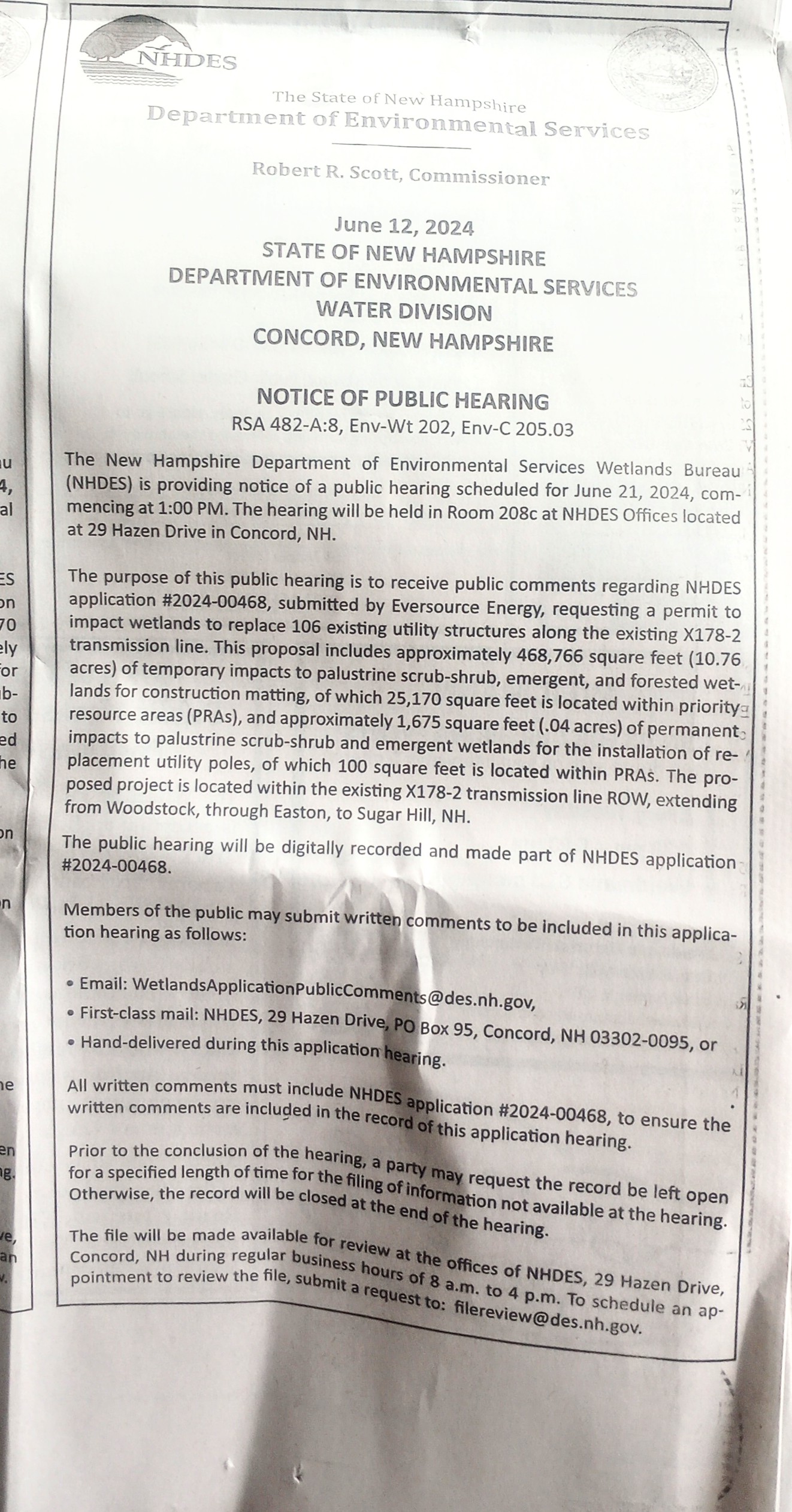 2025, January 7: Public Notice of Easton ZBA hearing on Eversource's request for a waiver from Easton's structure height restrictions.